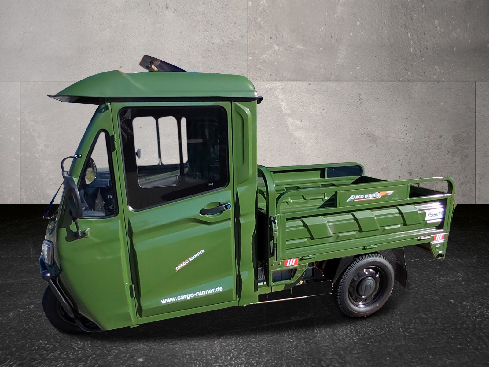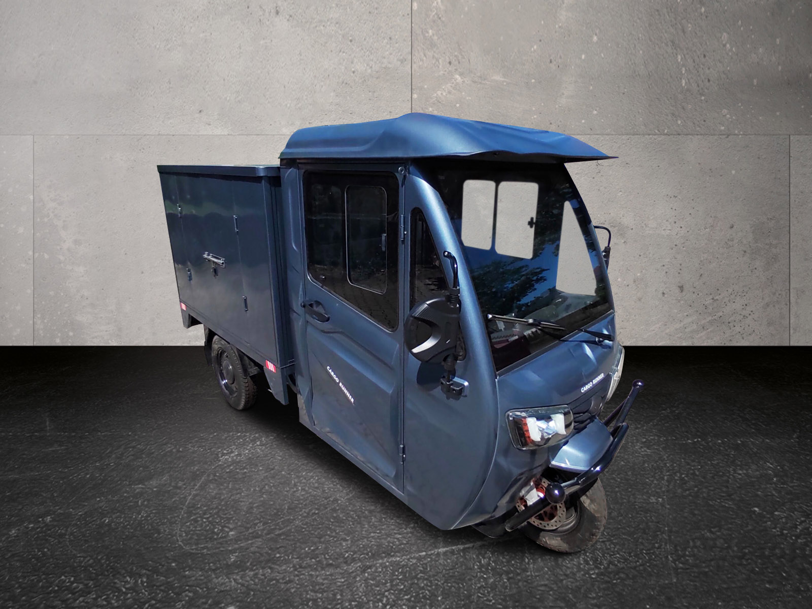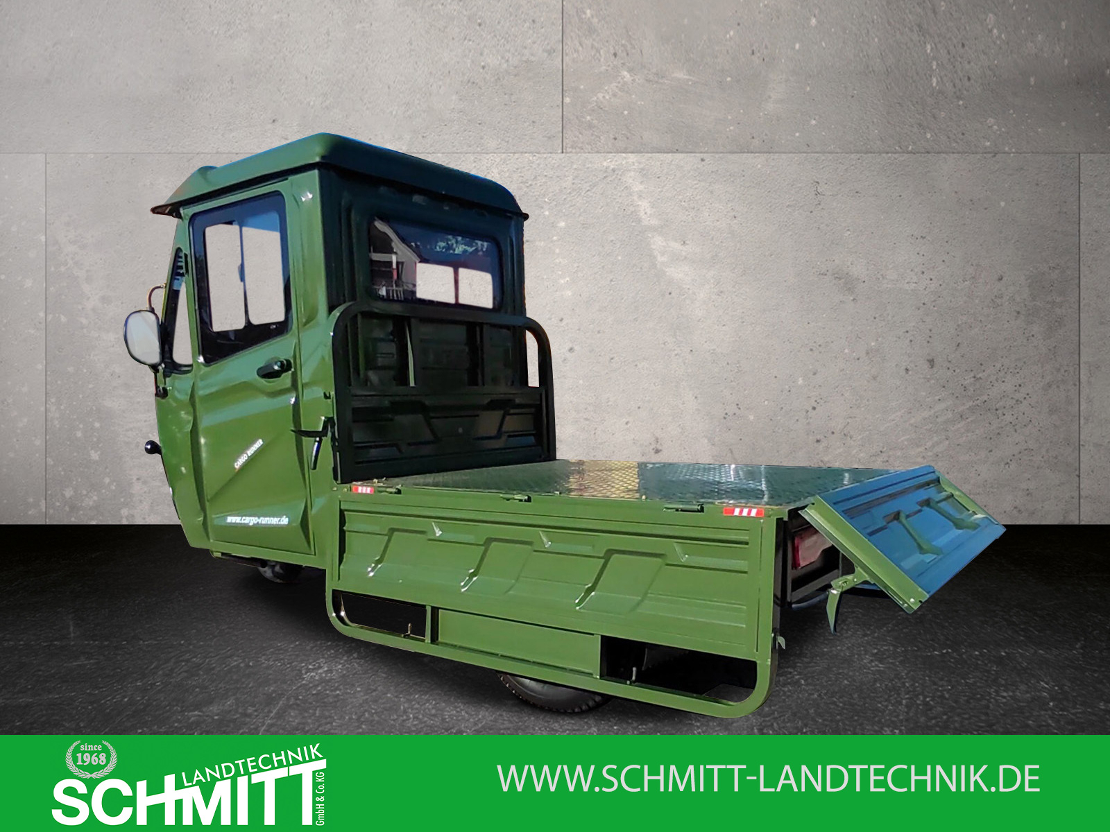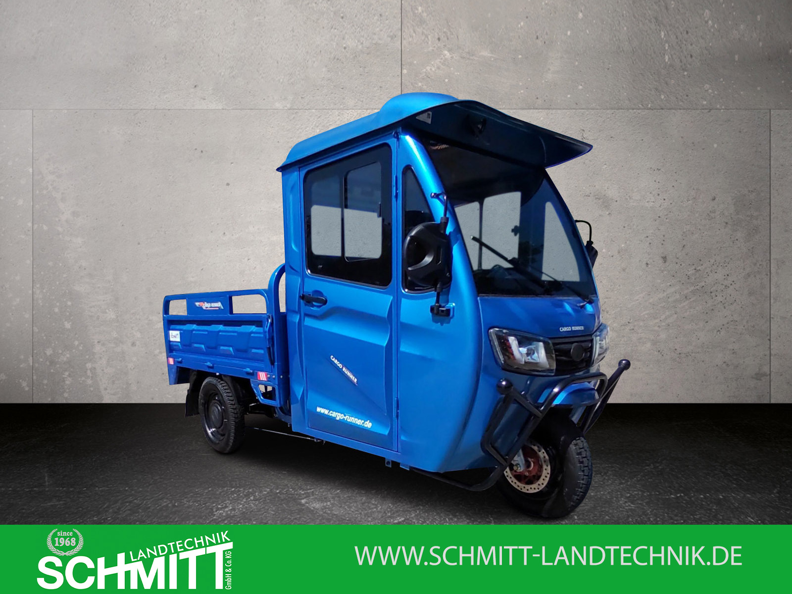 Dreiviertel-Ansicht des Cargo Runner Mega in Blau mit Kabine und Ladefläche
