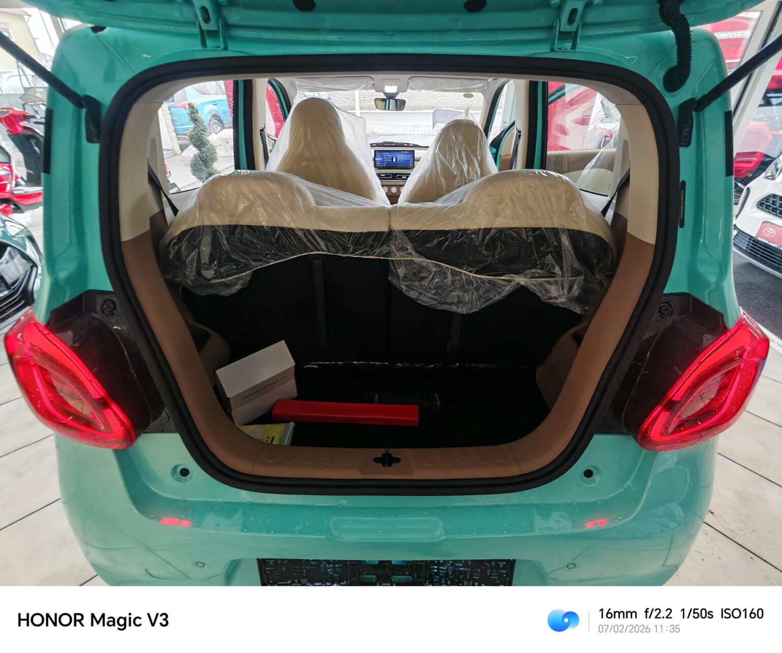 Trotz kompakter Außenmaße bietet das Fahrzeug ein erstaunlich variables Ladevolumen: Der Kofferraum fasst 123 Liter, ausreichend für zwei Wasserkästen, und wächst bei umgeklappten Rücksitzen auf bis zu 745 Liter.